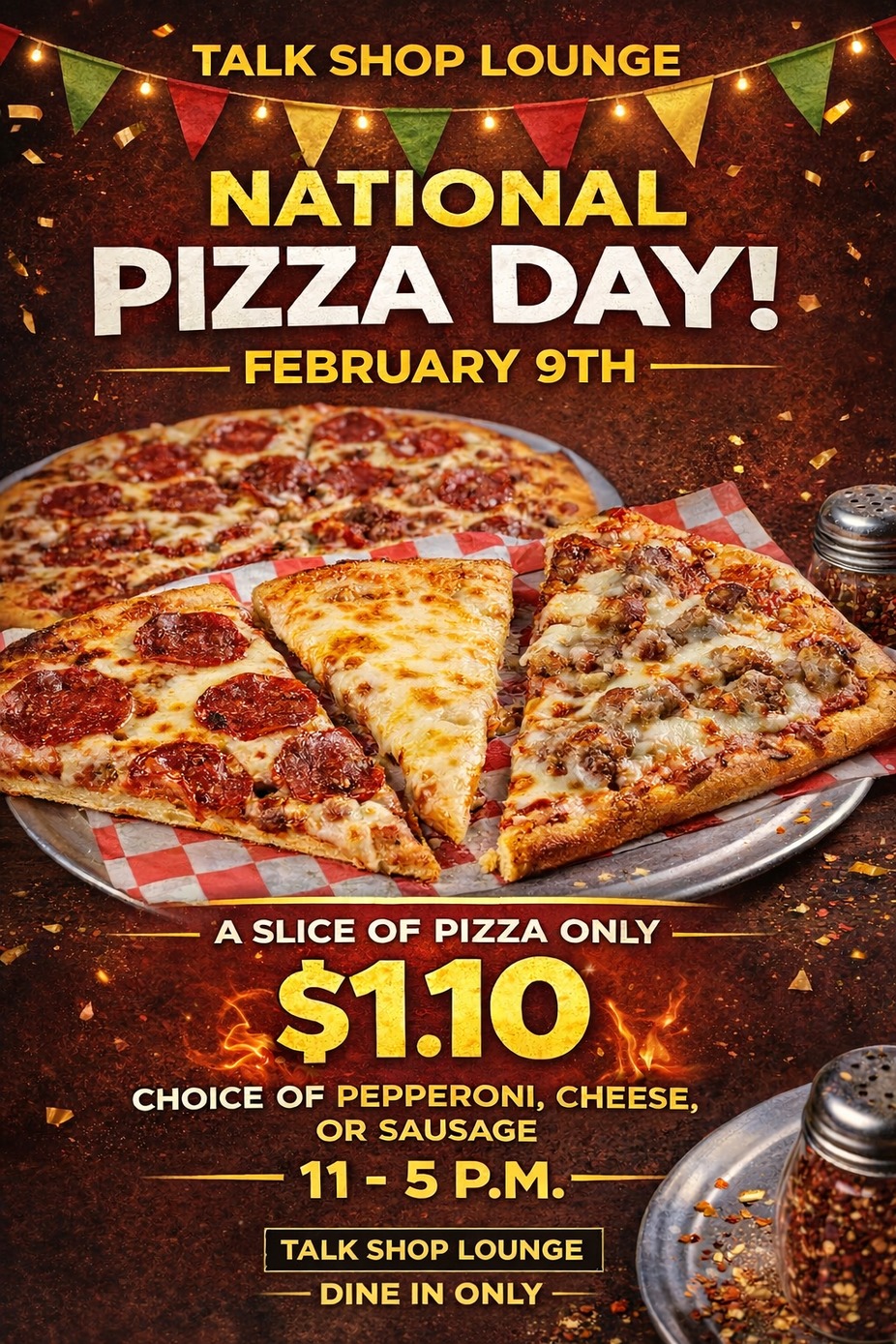 Join us for National Pizza Day February 9th at Talk Shop Lounge. Special is buy a slice of pizza for $1.10 Choice of Pepperoni, Sausage or Cheese. No other substitutions allowed. Special is for dine in only from 11am to 5pm.